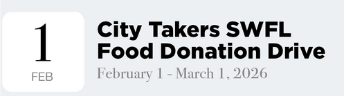 We have an amazing opportunity to bless our community through City Takers, an organization serving at-risk youth and families in Southwest Florida. We’re collecting non-perishable food items such as peanut butter, canned goods, pasta (whole grain preferred), and rice (brown preferred). Donations can be dropped off Sundays in the lobby or Monday–Thursday during office hours. Every donation makes a difference.