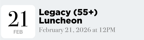 Join us in the cafeteria for a covered-dish Legacy Luncheon! This potluck-style gathering kicks off the relaunch of Legacy, our 55+ ministry, and will be an amazing time of fellowship and community. Bring a dish to share, enjoy meaningful conversation, and celebrate what’s ahead together.