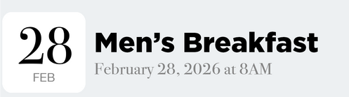Men 18 and older, make sure to join us for the Men's Breakfast in the cafeteria! This FREE event is a great opportunity to connect with other guys, grow in your faith, and enjoy a delicious breakfast.